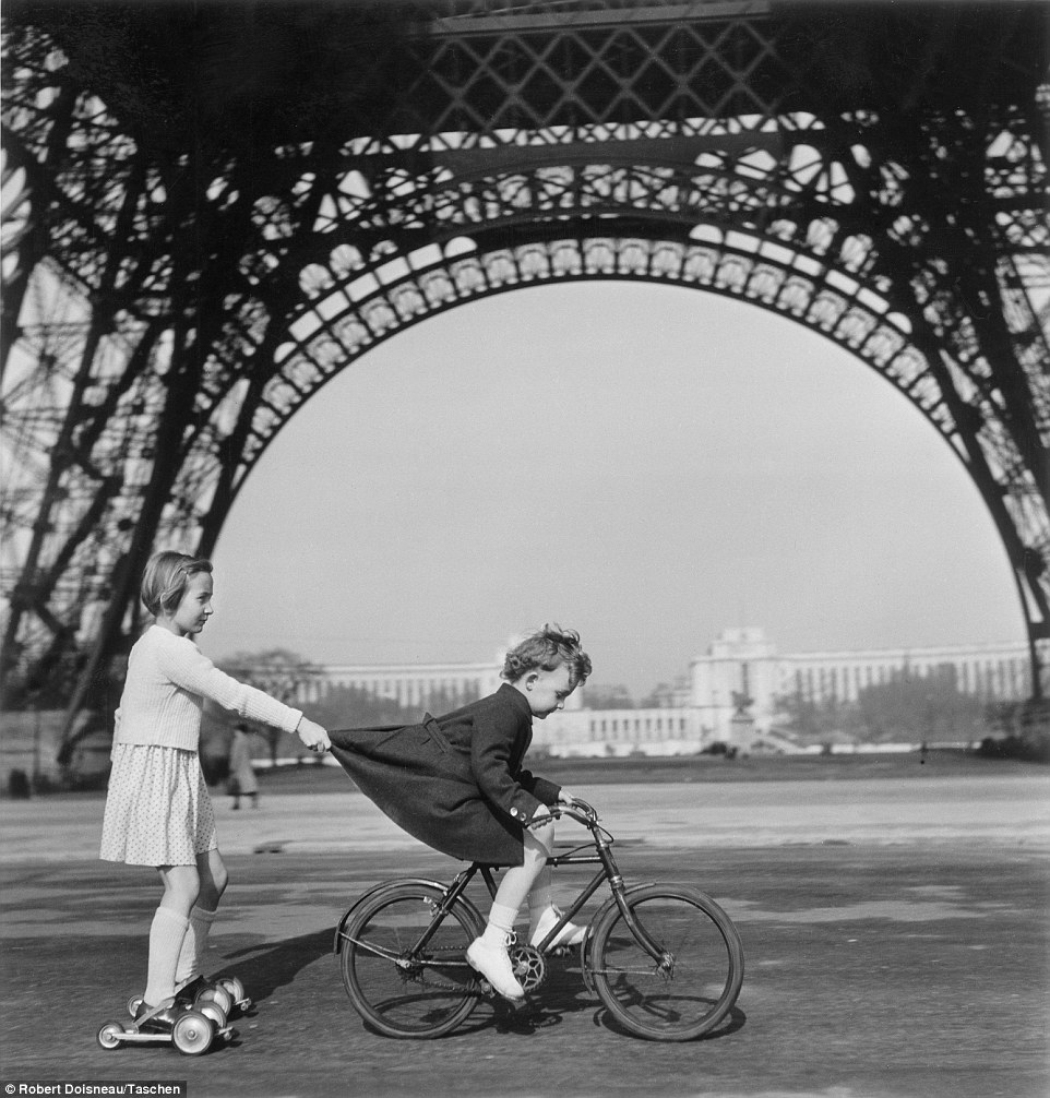 杜瓦诺拍摄嬉闹孩童的作品尤为见长,此图中的孩子正在埃菲尔铁塔下嬉戏。(网站截图)
