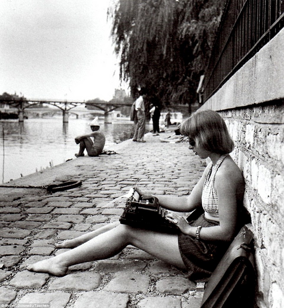 这幅作品摄于1947年,勤勉的职场女郎一边用打字机打字,一边享受日光浴。(网站截图)