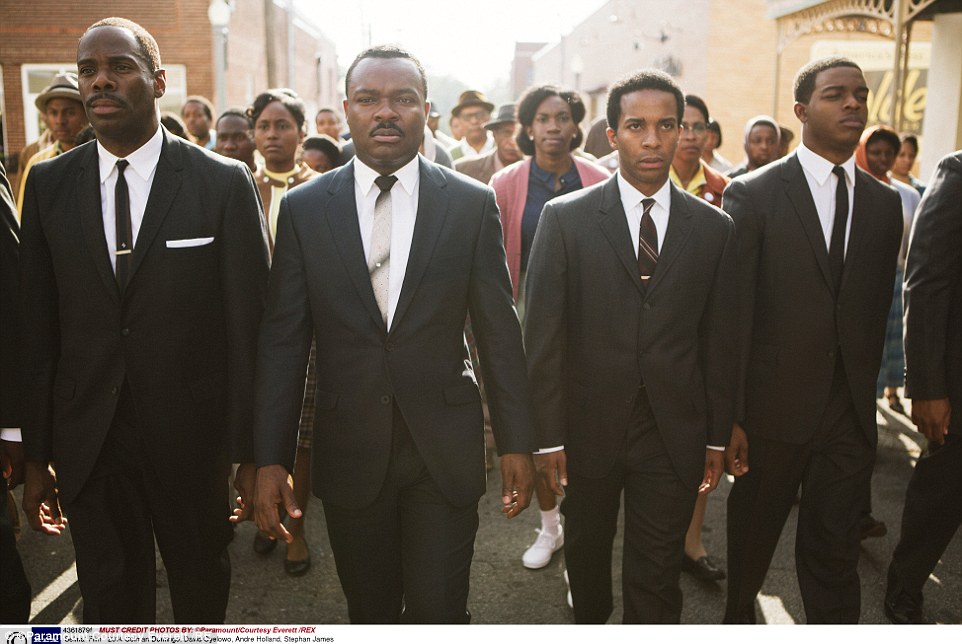 马丁路德金的扮演者大卫奥伊罗(左起第二个)。该图为《塞尔玛》片中场景,该影片今年入围奥斯卡提名。(网站截图)