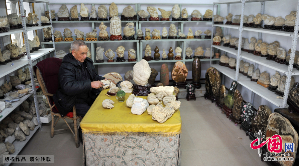 2月2日,游世贵老人在奇石馆内对云锦石进行打磨。中国网图片库 谢顺/摄
