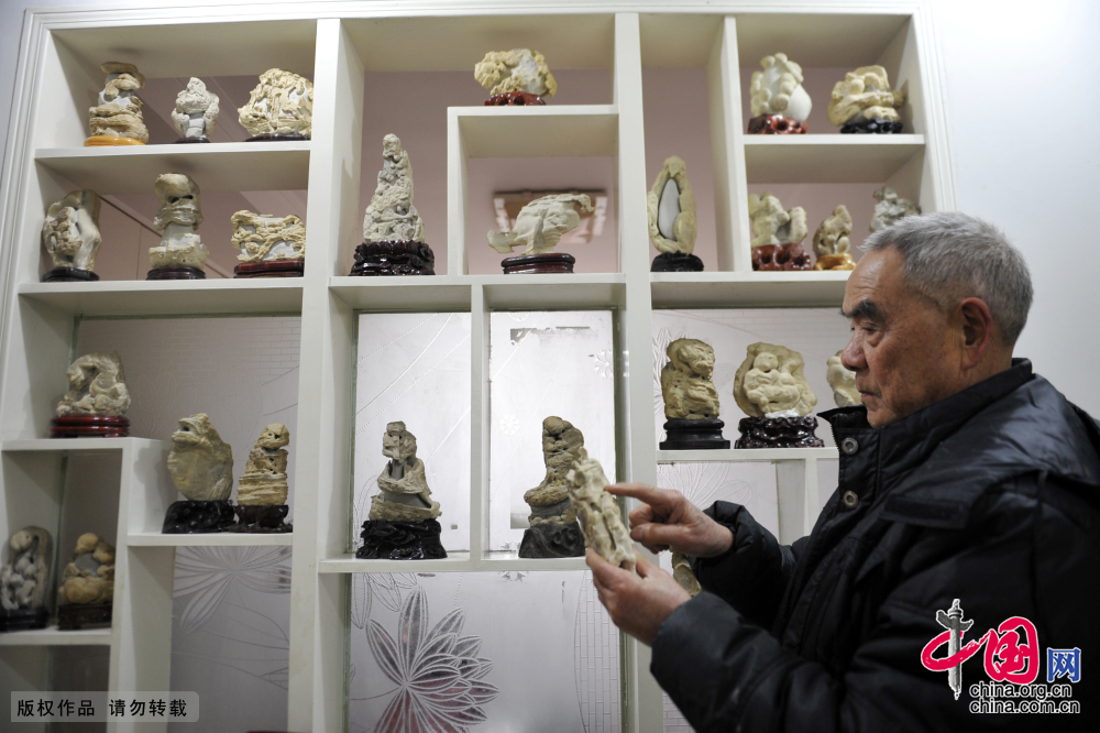 2月2日,游世贵观察一枚云锦石的造型。中国网图片库 谢顺/摄