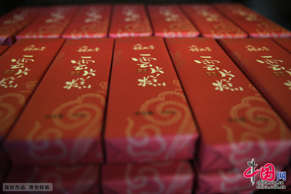 徽州名点“云片糕” 云片糕又名雪片糕,名点,其名称是由片薄、色白的特点而来的。其特点质地滋润细软,犹如凝脂,能久藏不硬,在制作上很为讲究,如炒糯米粉,一般要贮藏半年左右,以去其燥性;对绵白糖的选择也较严格;至于糕的切片要求也很高,每条糕块(长22厘米)一般要切140片左右。中国网图片库 吴孙民/摄