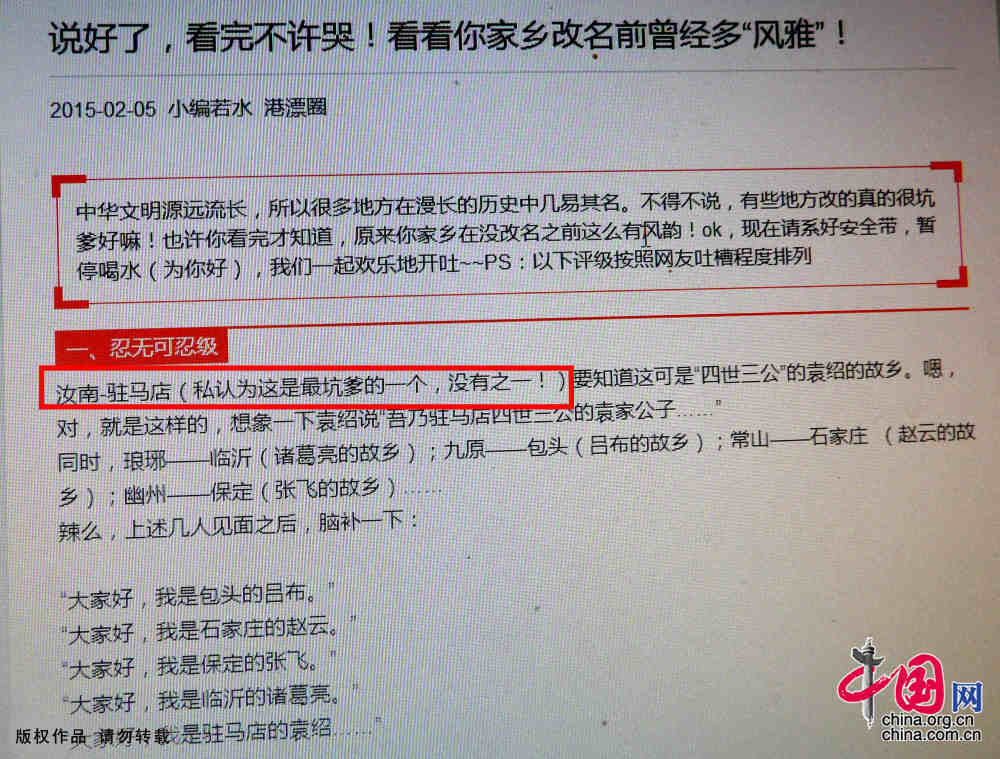 近期,微博、微信朋友圈疯狂吐槽“汝南”改名“驻马店”。此为网络截图。中国网图片库 孙凯
