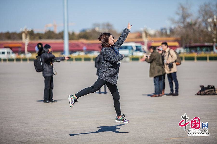 一位“悬浮”在广场上的调皮记者。 中国网记者 郑亮 摄影