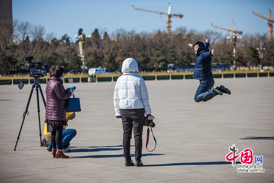 一位“悬浮”在广场上的调皮记者。 中国网记者 郑亮 摄影