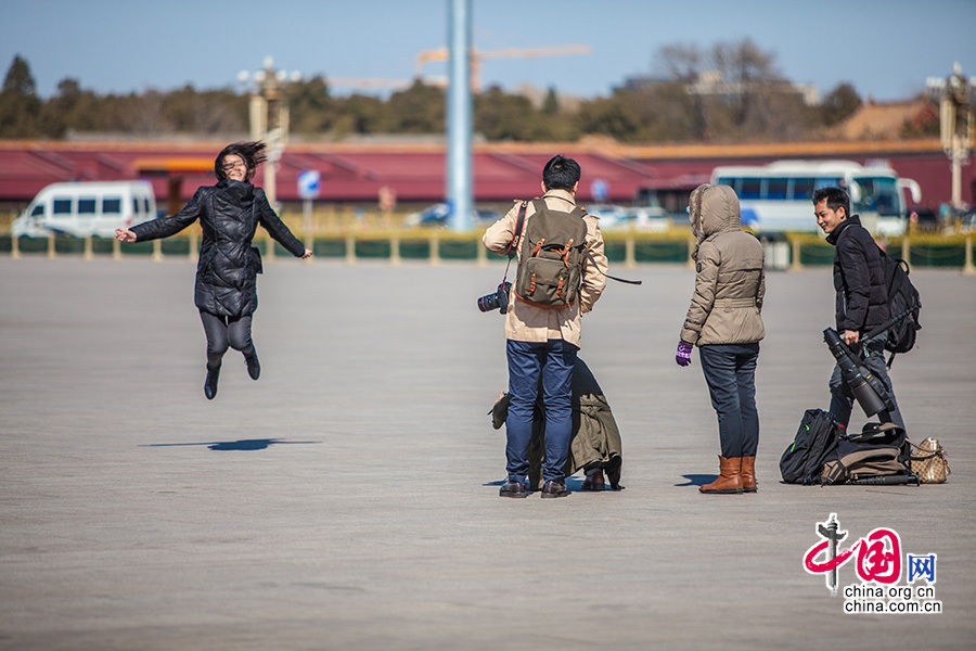 一位“悬浮”在广场上的调皮记者。 中国网记者 郑亮 摄影