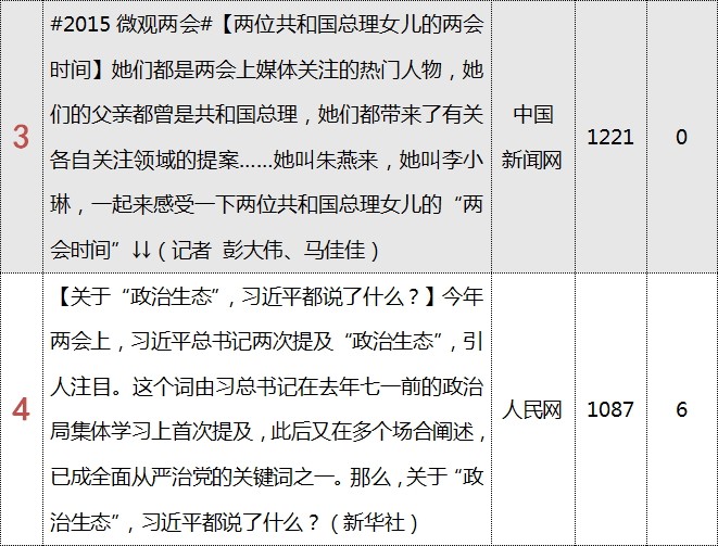 本排行监测时间为2015年3月10日零时至3月13日15时。以上微博均出现在14家中央新闻网站的官方新浪微博中,上表按照转发数排列。
