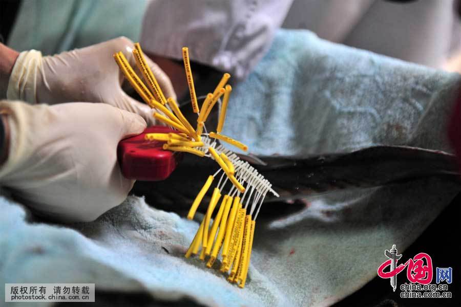 2015年3月20日,湖北省宜昌市中华鲟研究所工作人员在为准备放流的中华鲟打上体外标,这种标记体外可见,易于识别,可以防误捕。中国网图片库 张国荣 摄