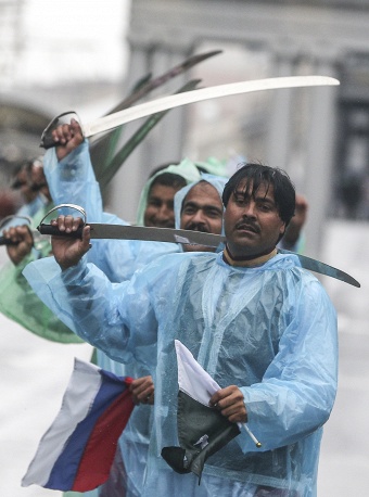 当地时间9月5日,前来参加莫斯科国际军乐节的中国、巴基斯坦、白俄罗斯、哈萨克斯坦、墨西哥等国军乐队不惧大雨,为莫斯科城庆倾情献艺,并与市民亲切互动。(网页截图)