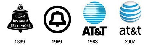 1969 年 AT&T 的徽标变成了非常简单的扁平化图样;1983 年 AT&T 的徽标变成了蓝白色的圆球,象征着全球化战略;2007 年这个扁平化的徽标变成了拟物化的球形徽标。