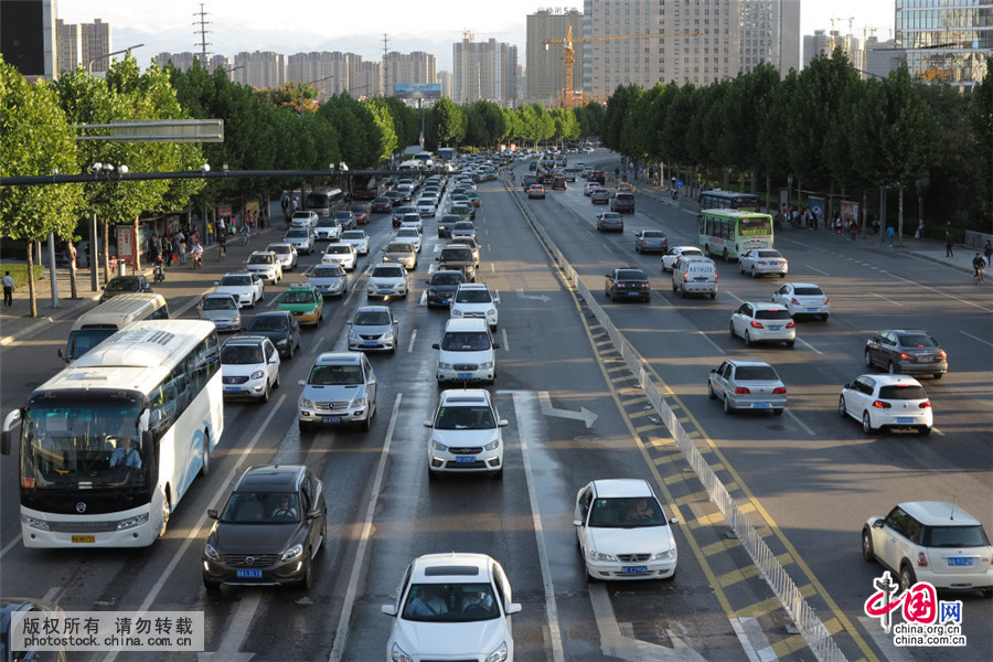2015年9月22日,世界无车日,西安市高新区唐延路最宽的路段虽然有10余个车道,但是晚高峰来临时,满满的车辆将10多个车道的路段塞得严严实实,恰似一个硕大的停车场。当日是世界无车日,早8点半在西安科技路沿线和晚6点在唐延路看到,道路上车辆行驶缓慢,就像一个大的停车场。中国网图片库 彭华/摄