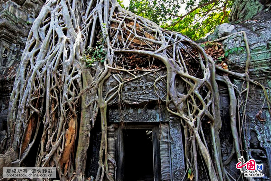 19世纪中叶,法国人柬埔寨吴哥发现塔普伦寺之后,因整座寺庙已被树根茎干极度纠缠盘结、难以清理而放弃整修,保持了原始模样,由此形成了塔普伦寺树寺一体的独特景象与标记。被当地人称为“蛇树”的卡波克树的粗大根茎,确如大蟒蛇一般盘绕、穿透、纠结,气势贲张,与神庙血肉相融、爱恨纠缠一般难舍难分,基本能领略当年探险家眼见的吴哥世界,电影《古墓丽影》在此取了著名的“树包屋”镜头。