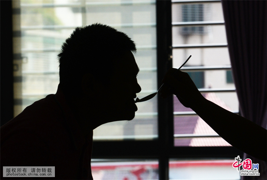 10月19日,黄海英在用勺子喂丈夫吃苹果,段湘军最爱吃苹果,每天都得吃几个。中国网图片库 李科/摄
