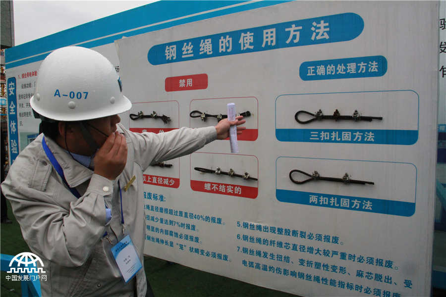 项目安全体验区不仅体验种类全面系统,还定期为员工开展安全培训,通过这些设施不仅可以让员工深刻体会到安全操作设备的具体作用,加强安全意识,还能让员工掌握发生危险后的自救方式,将培训搬到家门口,将安全培训形象化、生动化,切实做到防患于未然。图为工作人员讲解钢丝绳的使用方法。(中国发展门户网 焦梦摄)