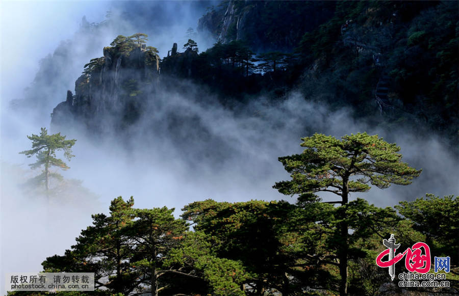 10月27日,在黄山风景区拍摄的云海美景。当日,安徽黄山风景区雨后放晴,出现了壮观迷人的云海。中国网图片库 作者:施广德