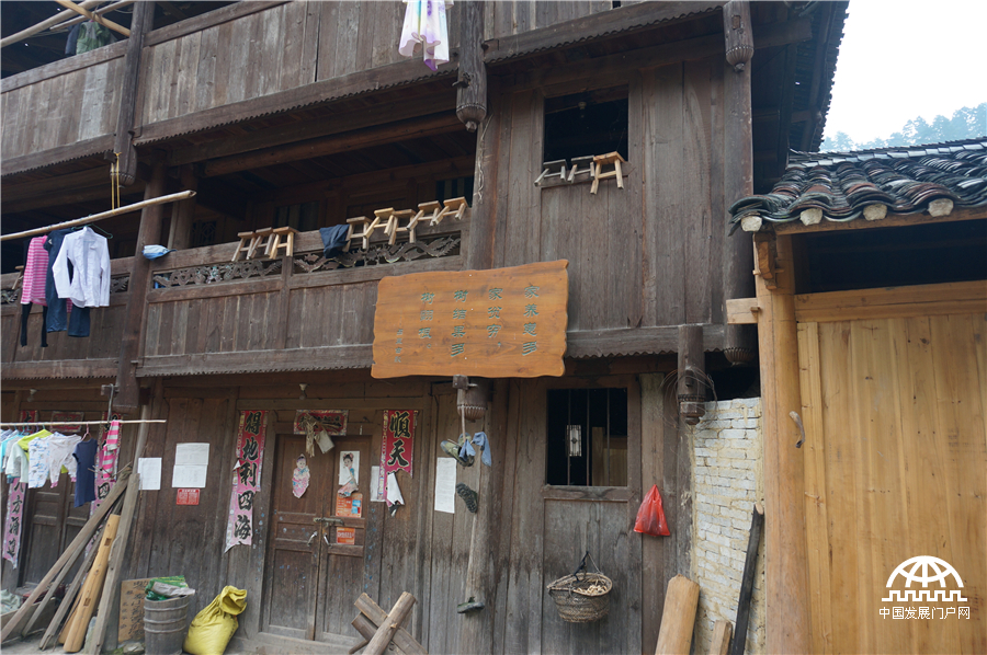 贵州从江县占里侗寨,这里随处可见人口生育宣传的汉字木牌标语,图中所写:家养崽多家贫穷,树结果多树翻根。 中国发展门户网 方青/摄