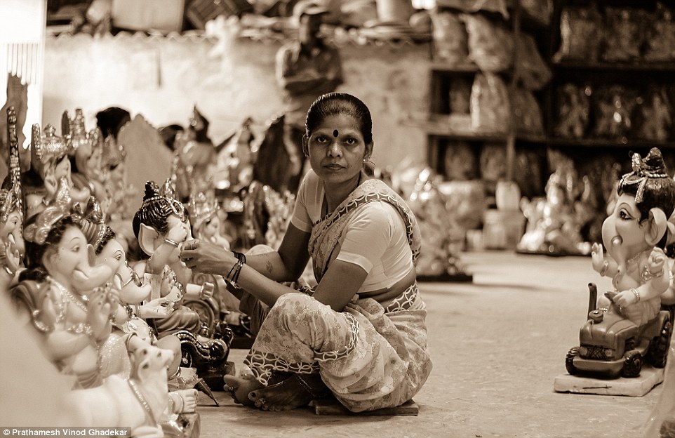 照片中一名女子在家中的后院制作印度教的“象鼻神”。(网站截图)