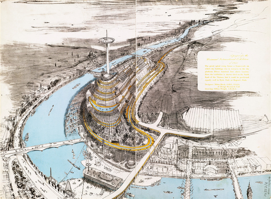 未采用的泰晤士河南岸设计图皇家节日音乐厅的设计在比赛中脱颖而出,1951年首次举办庆典活动。家节日音乐厅的设计师为皇家艺术学院的教授米莎·布莱克,他最著名的设计便是威斯敏斯特标志性的红黑色路牌。(网站截图)