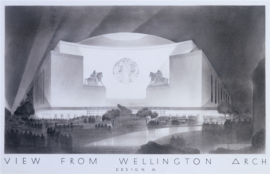 位于海德公园角的国际音乐厅和歌剧院设计图这张宏伟的设计图于1928年出自一位美国建筑师之手,伦敦兰斯伯瑞酒店现今坐落于此。(网站截图)