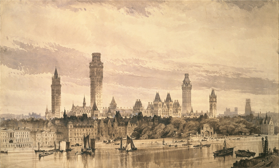 位于斯特兰德大街的英国皇家司法院该图为建筑师阿尔弗雷德·沃特豪斯1876年的比赛设计图,尽管此设计并未采纳,但他后来被任命设计自然历史博物馆。(网站截图)