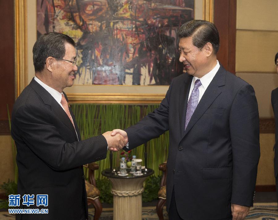 2013年10月6日,中共中央总书记习近平在印度尼西亚巴厘岛会见台湾两岸共同市场基金会荣誉董事长萧万长一行。新华社记者兰红光摄
