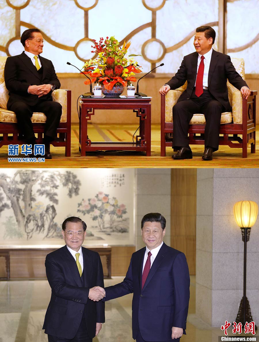 (上图)2014年2月18日,中共中央总书记习近平在北京钓鱼台国宾馆会见中国国民党荣誉主席连战及随访的台湾各界人士。 新华社记者鞠鹏摄(下图)2014年2月18日,中共中央总书记习近平在北京钓鱼台国宾馆会见了中国国民党荣誉主席连战及随访的台湾各界人士。中新社发 廖攀摄