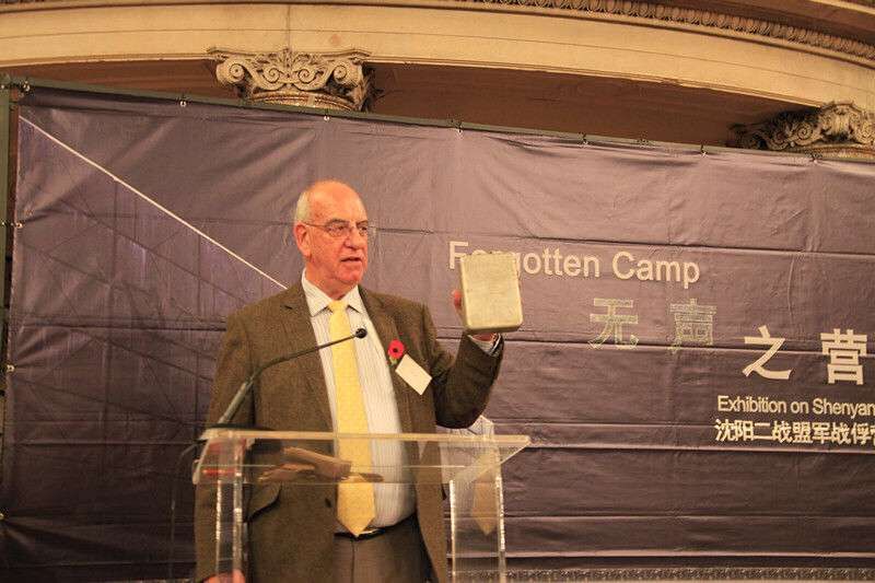 11月6日,《无声之营——沈阳二战盟军战俘营史实展》在英国利物浦市圣乔治大厅开幕。曾被关押在沈阳二战盟军战俘营的英国老兵罗纳德(Ronald Joy)的儿子艾兰(Alan Joy)把父亲当年在战俘营用过的饭盒捐赠给战俘营陈列馆作为展品。(中国日报马驰拍摄)
