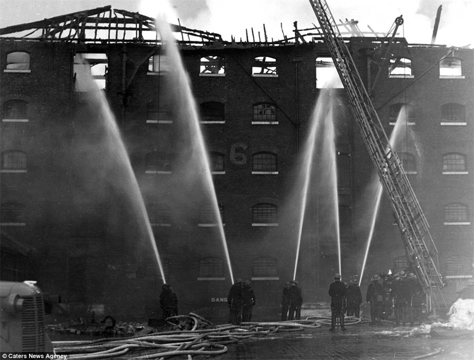 黑白照片再现二战期间伦敦消防队灭火现场。(网站截图)