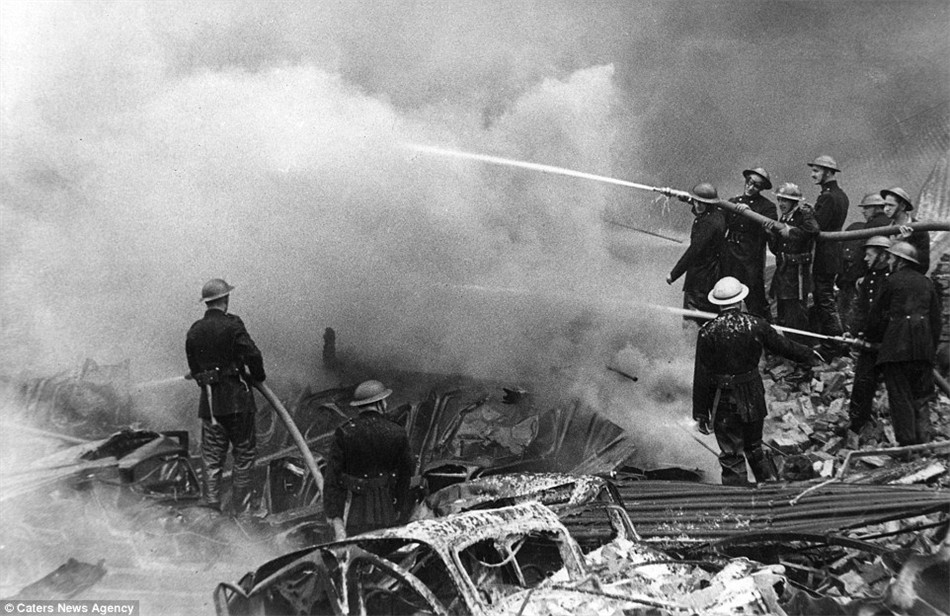 黑白照片再现二战期间伦敦消防队灭火现场。(网站截图)
