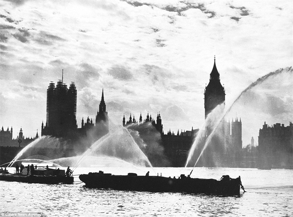 黑白照片再现二战期间伦敦消防队灭火现场。(网站截图)