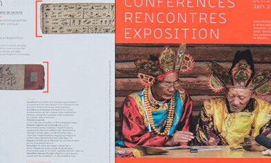 展览宣传册:两位老东巴祭司在释读法国国家图书馆的东巴藏本,朱宇老师于2014年摄于香格里拉白水台。