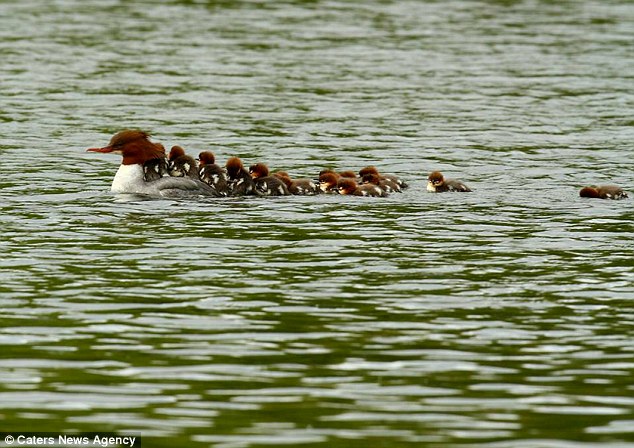 摄影师马克(音译)在英格兰西北部兰开夏郡拍摄到一组非常有趣又有爱的照片。池塘边,一只雌鸭子为了带着自己的16个“孩子”(小鸭子),将它们背在自己的身上过河。(网站截图)