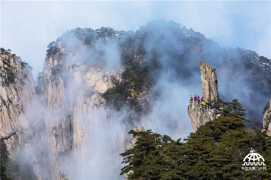 中国网/中国发展门户网讯(叶永清 方立华)11月25日,笔者在黄山风景区贡阳山观赏到云海中飞来石美景。当天,波浪起伏的云海在飞来石周围翻滚,如潮水般地拍打着险峰峭壁上。单独耸立飞来石,就象一艘帆船一样在波涛海面中航行,美得让人窒息。