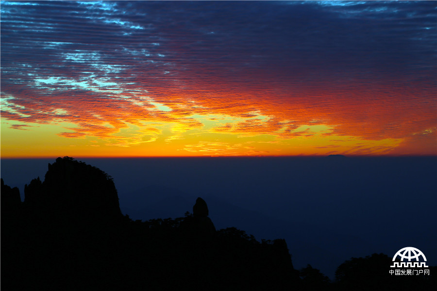 中国网/中国发展门户网讯(叶永清 方立华)11月25日,笔者在黄山风景区贡阳山观赏到云海中飞来石美景。当天,波浪起伏的云海在飞来石周围翻滚,如潮水般地拍打着险峰峭壁上。单独耸立飞来石,就象一艘帆船一样在波涛海面中航行,美得让人窒息。