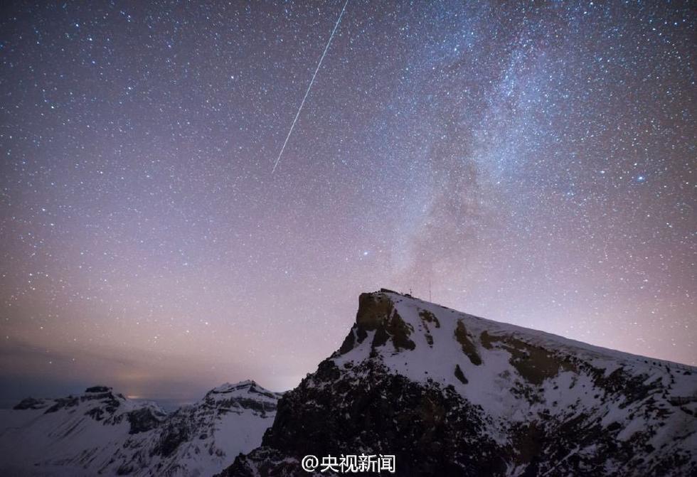 14日夜至15日凌晨,北半球三大流星雨之一的双子座流星雨,迎来流量最大时刻!每小时天顶流量或超120颗!并且,整夜都能观测到流星!图为今日凌晨,极大值前夜的双子座流星雨与长白山。(央视记者万灵摄影师卓永生)