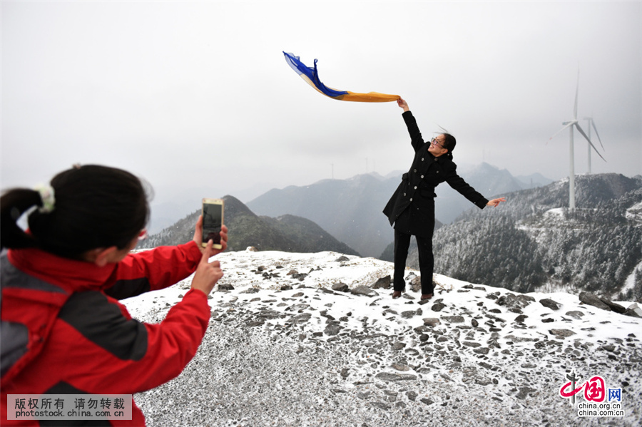 12月18日,一场冬雪过后,游客在大堡梁风电场观雪景,看风力发电。