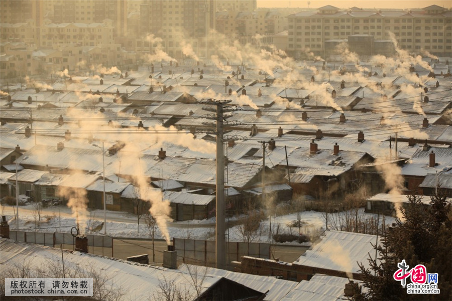 2015年12月22日,黑龙江省黑河市,黑河市郊区棚户区居民正在燃煤供暖。中国网图片库 魏建顺/摄