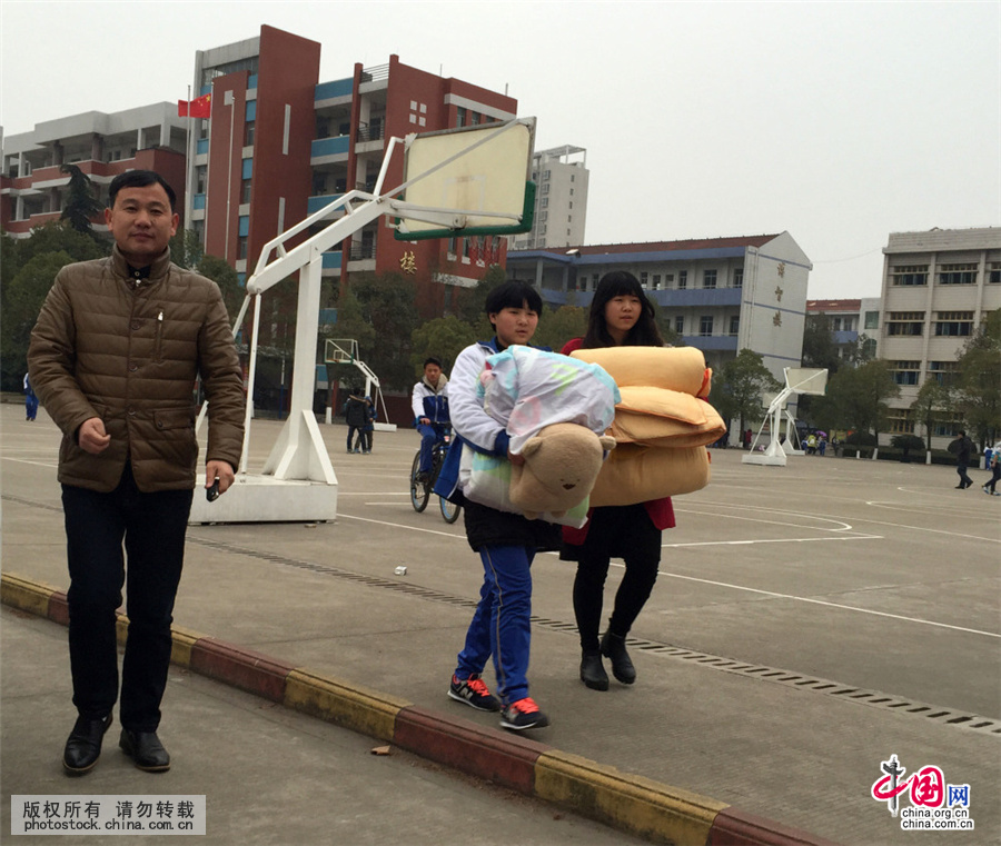1月20日,湖南省常德市澧县第二中学,1名家长(左)与其他抱行李的学生一起准备回家。中国网图片库 柏依朴/摄