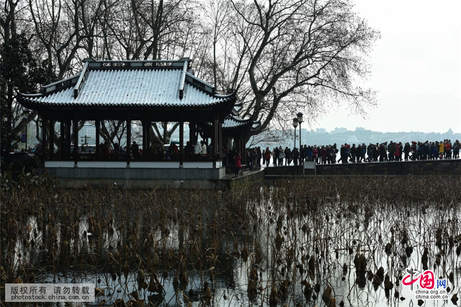 2016年1月23日,浙江省杭州市,游客在杭州西湖断桥观赏雪景。中国网图片库 龙巍/摄