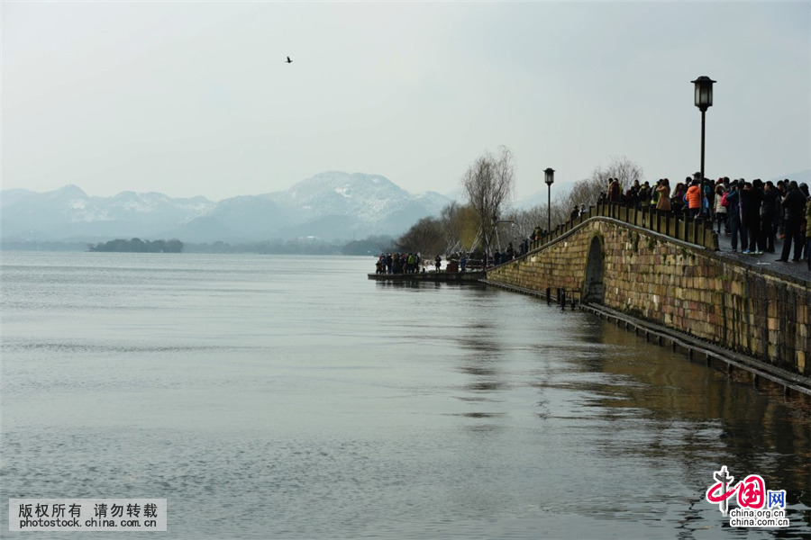 2016年1月23日,浙江省杭州市,游客在杭州西湖断桥观赏雪景。中国网图片库 龙巍/摄