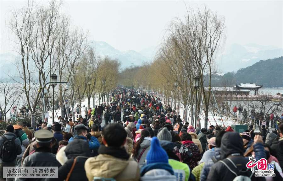 杭州西湖断桥人潮汹涌赏雪景 场面堪比黄金周