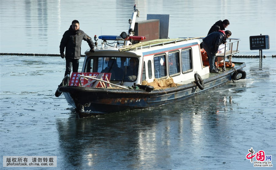 2016年1月25日,浙江省杭州市,杭州西湖水域管理处的工作人员在敲破西湖水面的冰层。 当日,杭州主城区出现最低-9.3℃气温,逼近1969年的历史极值,受此影响,杭州西湖部分水域出现严重结冰现象,杭州西湖水域管理处也首次出动破冰船破冰。中国网图片库 龙巍/摄