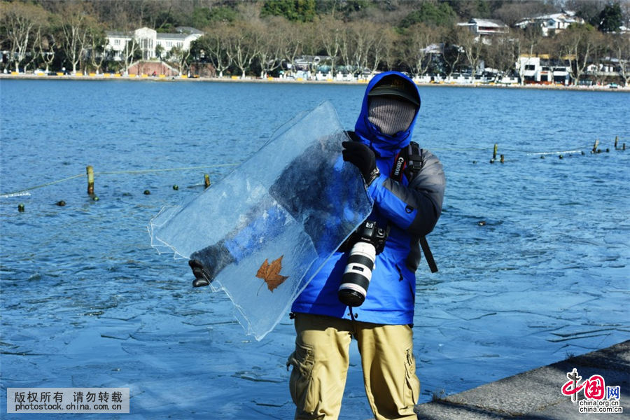 2016年1月25日,浙江省杭州市,游客在展示杭州西湖水面的冰块。中国网图片库 龙巍/摄