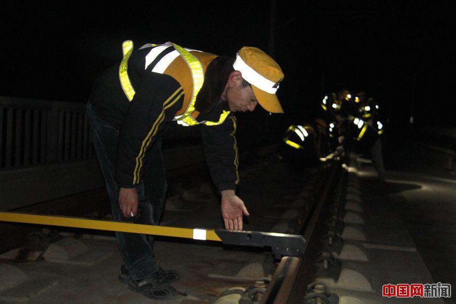 工长王社昌使用电子道尺测量线路几何尺寸。