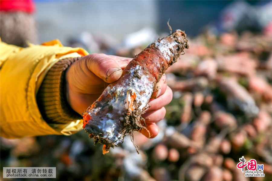 2016年2月16日,安徽宿州,萧县孙圩子乡红萝卜基地受寒冬影响,红萝卜普遍受冻,腐烂发霉,被当地种植户当垃圾扔到路边和垃圾堆里,造成损失惨重。