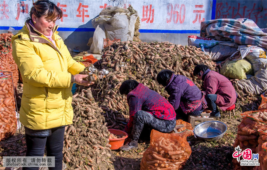 2016年2月16日,安徽宿州,萧县孙圩子乡红萝卜基地受寒冬影响,红萝卜普遍受冻,腐烂发霉,被当地种植户当垃圾扔到路边和垃圾堆里,造成损失惨重。图为家住萧县孙圩子乡桃园村的种女植户郭红梅在展示发霉腐烂的胡萝卜。中国网图片库 吴克涛/摄