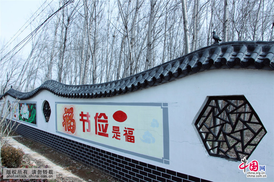 2016年2月19日,在山东济宁255省道附近,有一环形复古围墙显得特别醒目,外墙附有节俭是美德、孝德是责任等显眼墙绘图案,窗户如同玄关般有序分布,围墙设有东西两个大门,都是铁将军把门。据了解,此处原是坟墓聚集地,后因该区域作为试点项目,大量的坟墓影响形象,于是在其外缘建起围墙,利用墙绘图案和复古建筑风格转移眼球,如同江南园林,成为名副其实的“环形坟墓遮羞墙”。中国网图片库 王兆峰/摄