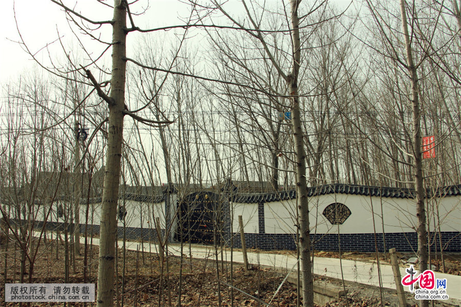2016年2月19日,在山东济宁255省道附近,有一环形复古围墙显得特别醒目,外墙附有节俭是美德、孝德是责任等显眼墙绘图案,窗户如同玄关般有序分布,围墙设有东西两个大门,都是铁将军把门。据了解,此处原是坟墓聚集地,后因该区域作为试点项目,大量的坟墓影响形象,于是在其外缘建起围墙,利用墙绘图案和复古建筑风格转移眼球,如同江南园林,成为名副其实的“环形坟墓遮羞墙”。中国网图片库 王兆峰/摄