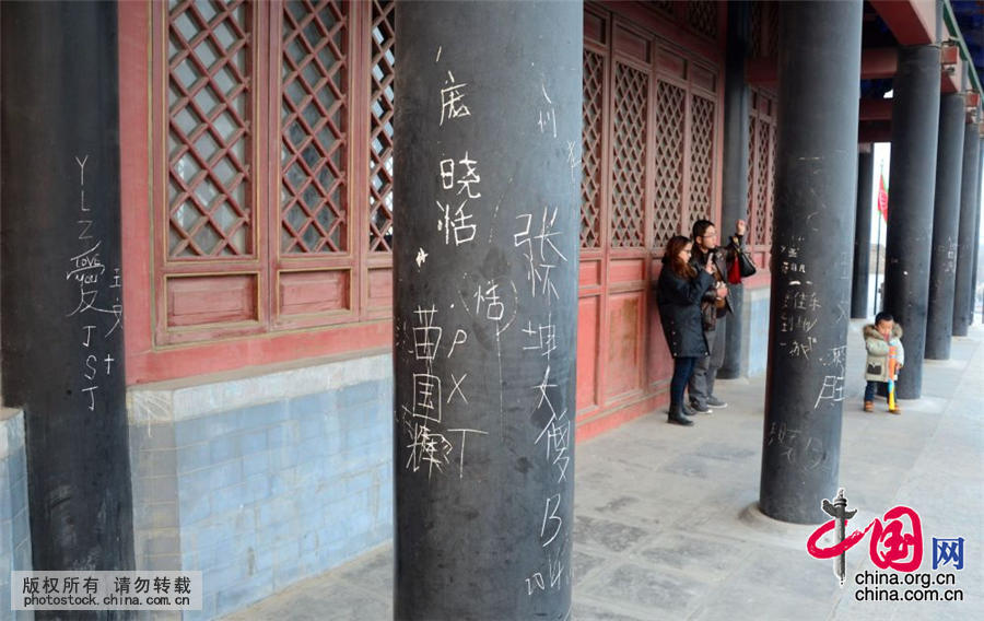 图为城楼柱上被涂刻满了各种“秀恩爱”的字。中国网图片库 佚名/摄