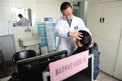 昨日,宣武医院脑血管病知名专家团队成员段建刚医生正接诊患者。新京报记者 吴江 摄